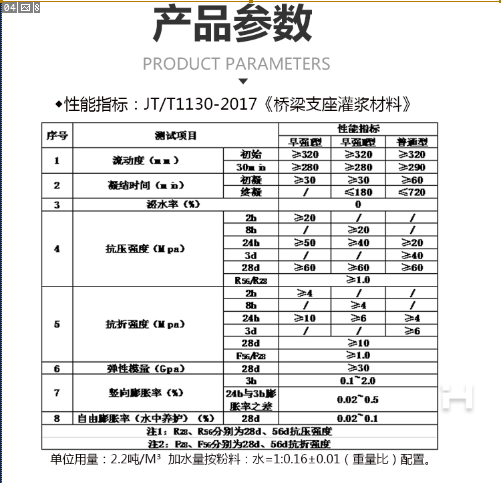 3、無(wú)收縮、粘結強度高: 具有微膨脹,與鋼筋有很好的握裹力。確保地腳螺栓和機座(鋼結構)基礎以及新老混凝土牢固結合。