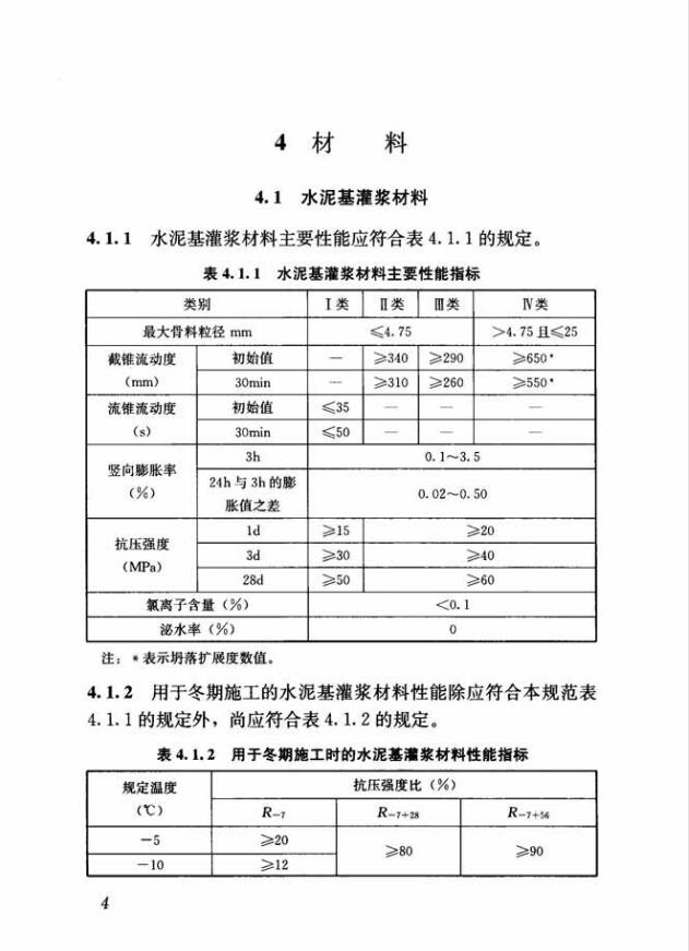對于快凝快硬型水泥基灌漿材料,由于早期強度高,甚至2h的抗壓強度能達到20MPa,其流動(dòng)性損失必然大,因此表4.1.1的30min流動(dòng)度保留值不適用于快凝快硬型水泥基灌漿材料。本規范對該類(lèi)水泥基灌漿材料的流動(dòng)度(或坍落度和坍落擴展度)的保留值、24h與3h的豎向膨脹率之差及24h內抗壓強度值不作規定。